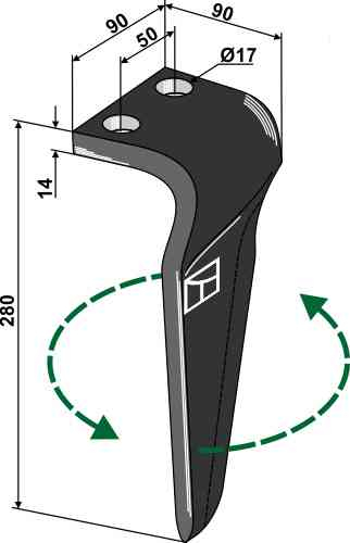 Normalerweise ist ein Bauteil mit der Maschine durch einen Bolzen oder eine Schraube verbunden. Außerdem ist es wichtig zu wissen, dass nicht jede Zinke universell montiert werden kann. Sie rotieren entweder rechts herum oder links herum. Im Fall von 38100223 und unserer passenden Alternative passt diese Kreiseleggen-Zinke auf die links Seite.