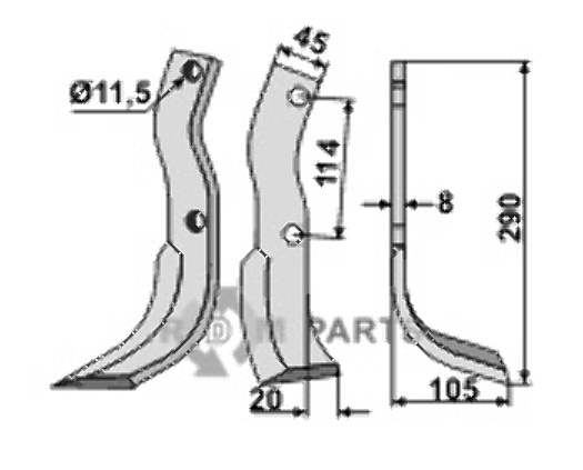 RDM Parts also has the 808-HOW-14R Blade, right model fitting for Howard 626094(624399) with an equal length as the original. The Blade, right model fitting for Howard 626094(624399) is 290 millimeter long. The original and the part from RDM Parts 808-HOW-14R are equal in width. This Blade, right model fitting for Howard 626094(624399) is 45 millimeter in width. The thickness of Blade, right model fitting for Howard 626094(624399) indicates something about the wear and tear of a part, but also if this will fit on your machinery. 8 millimeter thick is the Blade, right model fitting for Howard 626094(624399) from howard with the original part number 626094(624399). The alternative that is offered by RDM Parts with number 808-HOW-14R has an equal thickness and is thus a suitable alternative for the original. The hole spacing measures the distance between the two mounting holes on the Blade, right model fitting for Howard 626094(624399). With these mounting holes the part can be attached to the machine from howard. To get it tightly fit, the distance between the holes on the new part and the old part should be equal. The hole spacing of this Blade, right model fitting for Howard 626094(624399) 808-HOW-14R is 114 millimeter. This 808-HOW-14R Blade, right model fitting for Howard 626094(624399) has a mounting hole of 11,5 millimeter. The mounting holes help to make a connection between the part and the machine. For some parts there are multiple mounting holes to mount the part.
