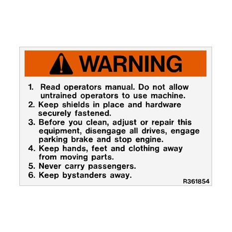 De decal - caution met ons onderdeelnummer R361854 is een passend alternatief voor één of meerdere andere (originele of niet originele) onderdelen. De onderdeelnummers van deze onderdelen zijn: 95651 jacobsen 361854.